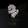 Make a dramatic statement with the Celestial Bloom silver ring — an exquisite display of artistry and elegance. This standout piece features a bold floral-inspired swirl design, encrusted with a graceful combination of teardrop-shaped and round-cut sparkling stones. Intricately arranged in a layered pattern, it gives an illusion of movement and radiance, much like a blossoming star in the night sky.